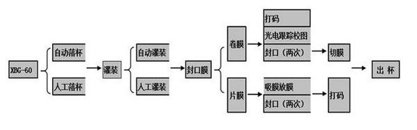 主要特點: 全自動塑料杯盒碗灌裝封口機可以自動下杯、下盒、自動放蓋、自動封口、自動出杯、吸蓋與封口同時完成,下膜移動對蓋膜定位精度無影響。可調節生產速度,采用凸輪分度器,使下膜定位精確,機器運轉平穩;準確的二次封口、封口壓力可調整,封口強度好。灌裝量根據工藝要求可調,灌裝精度符合JP計量標準。 技術參數: 型 號:XBG60-3 使用電源:三相四線 380V/50HZ 產 量:1800-2000杯/小時 功 率:2KW/H 外型尺寸:3000mm×600mm×1600mm 溫控范圍:0-400℃ 耗 氣 量:0.6m3/s 工作氣壓:0.65-0.85MPA 重 量:700kg 全自動塑料杯灌裝封口機生產流程圖:
